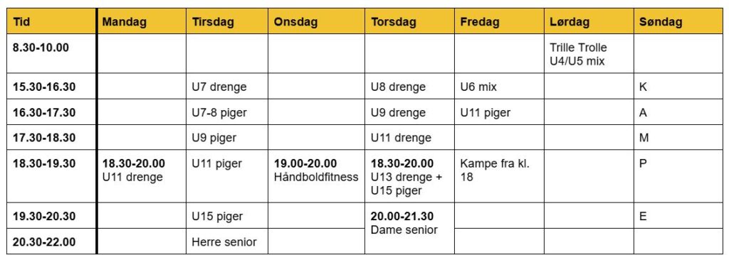 | U15 piger | 19:30 – 20:30 | 18:30 – 20:00 | Evt. kampe |